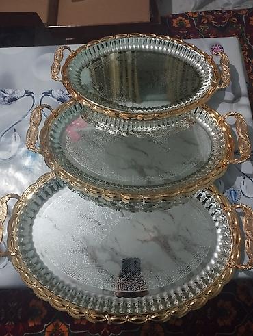 - Овальные подносы с зеркальным дном — комплект из 3 штук разного размера. Рифленый край, изящные двойные ручки с золотистым покрытием. Зеркальная поверхность с гравированным узором; бортик и окантовка — золотистые.