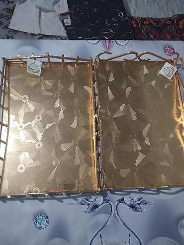 - Прямоугольные подносы (2 шт.) с высокими бортиками и ручками, золотистое покрытие. Дно с тисненым цветочным рисунком.