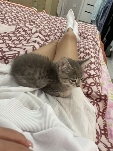 Серый котёнок с короткой шерстью и выразительными янтарными глазами. Окрас — дымчато-серый с лёгкими табби-полосками, светлая грудка и живот, тёмный кончик хвоста. Большие уши, аккуратные лапки, пуховый хвост.