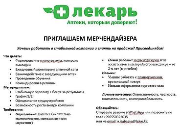 СЕТЬ АПТЕК «ЛЕКАРЬ» ПРИГЛАШАЕТ СУПЕРВАЙЗЕРА