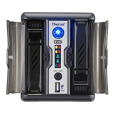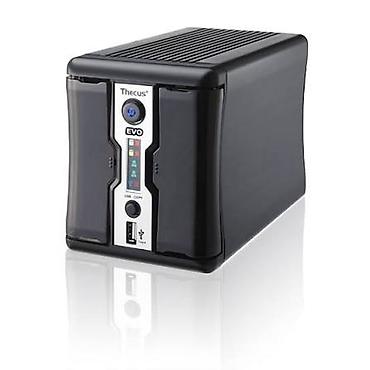 Сетевое хранилище данных NAS Thecus EVO в черном корпусе предназначено для организации централизованного хранения и доступа к файлам. Устройство оснащено несколькими отсеками для жестких дисков, обеспечивая гибкость в конфигурации хранилища. На передней панели расположены индикаторы состояния, кнопка питания, а также порт USB с функцией "USB Copy" для быстрого резервного копирования данных с внешних накопителей. Компактный дизайн позволяет разместить его на рабочем столе или в серверной стойке.