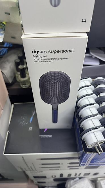 - На коробке: Dyson Supersonic Styling accessory / Styling set (Dyson-designed Detangling comb and Paddle brush) — вариант набора может включать щетку-лопатку и гребень для распутывания.