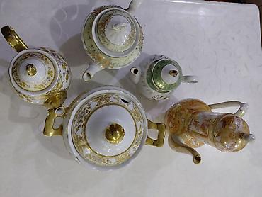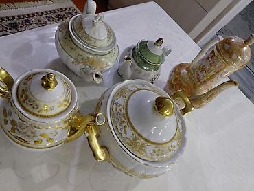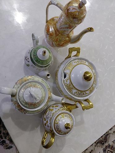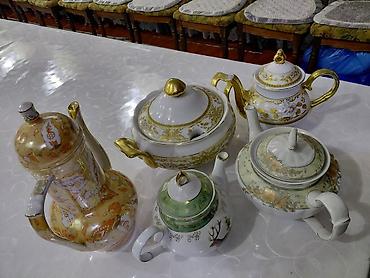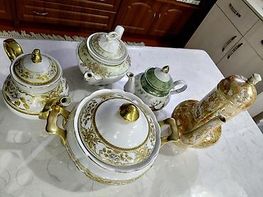 - Все чайники с крышками, акценты — позолоченные ручки, носики и навершия.