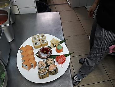 - Авторские наборы на овальных блюдах: несколько видов роллов, в том числе в оранжевой и белой панировке, запечённые роллы с соусом, кусочки лосося сашими, имбирь, васаби.