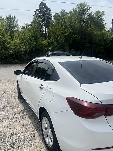 Белый седан Chevrolet Onix. Автомобиль оснащен передними фарами характерной формы и решеткой радиатора с горизонтальными ламелями и логотипом бренда. Дизайн кузова подчеркивают затемненные задние ф...