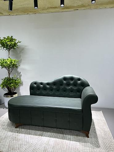 - Обивка: тёмно‑зелёная экокожа с капитоне (пуговичная стяжка на спинке и цоколе)