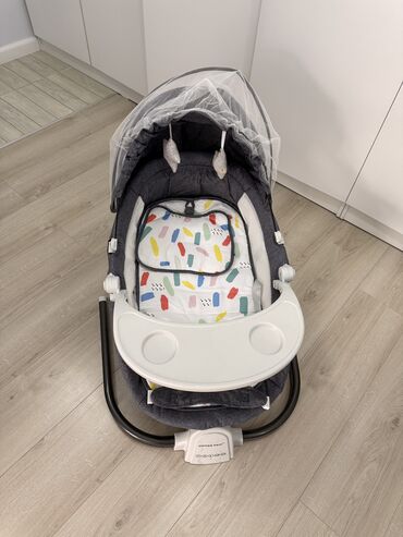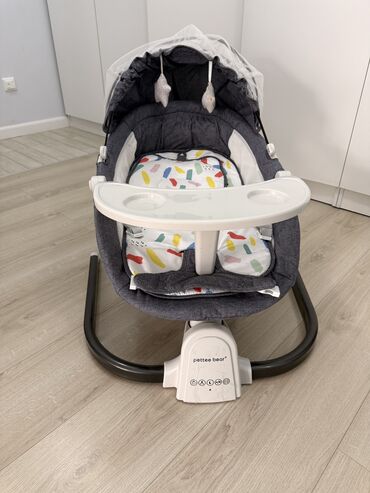 Шезлонг для младенцев. С удобным сиденьем с ремнями безопасности, обеспечивающими надежную фиксацию ребенка. Качели имеют функцию укачивания и предлагают различные режимы, что помогает успокоить м...