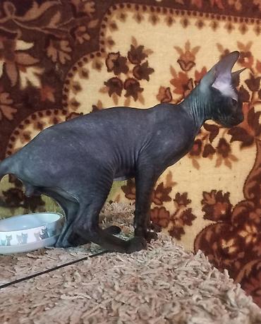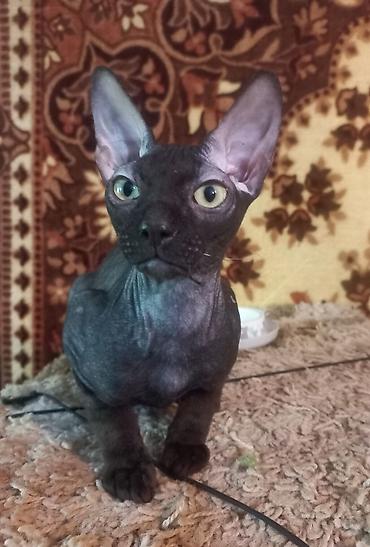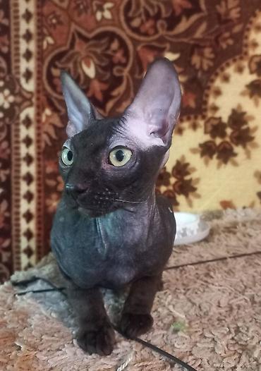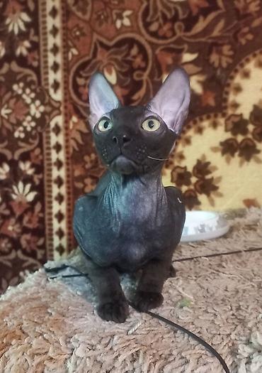 Выставляется на продажу 6-ти месячный котёнок (мальчик) породы донской сфинкс велюровый, чёрного цвета. Проглистован, лоток знает на 5+, к когтеточке приучен. Характер - любопытный, игривый, очень ласковый и ручной мальчишка.