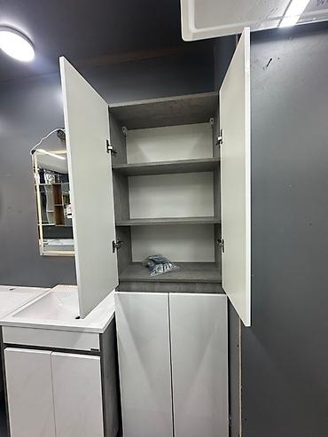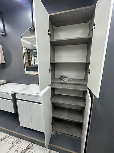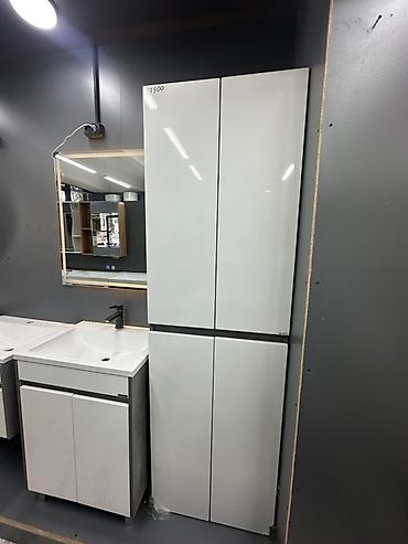 Шкаф-пенал для ванной комнаты с глянцевыми белыми фасадами. Состоит из двух секций с дверцами, внутри расположены полки для хранения. Идеальное решение для организации пространства в ванной.