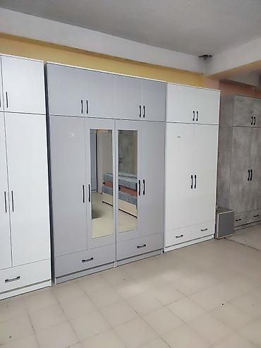 - Конфигурация: многосекционный шкаф с распашными дверцами; центральный блок с двумя зеркальными фасадами в полный рост.