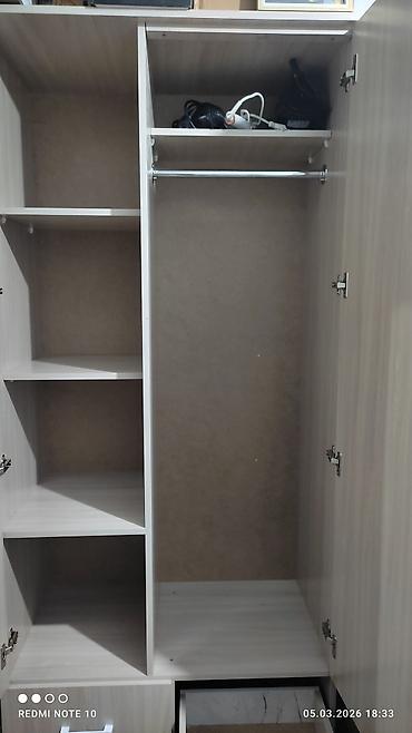 - Компоновка: слева — секция с тремя открытыми полками для сложенных вещей; справа — отделение со штангой для вешалок и верхней полкой для аксессуаров/коробок.