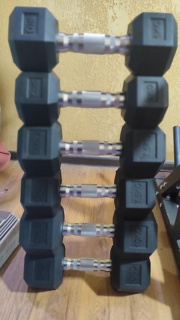 - Набор гантелей шестигранных с резиновым покрытием и хромированными рукоятями: пары по 5 кг, 7,5 кг и 10 кг.