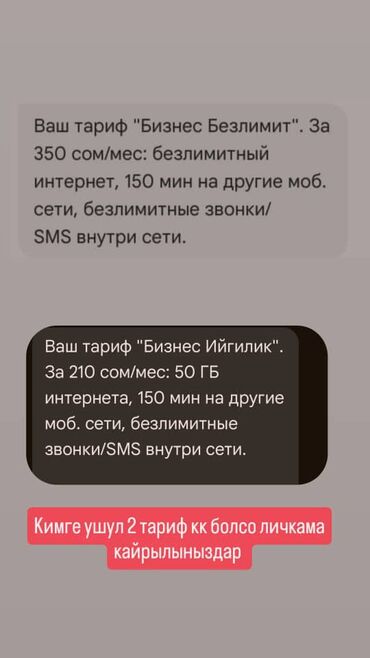 Новый выгодный тариф для мобильной связи - 50 ГБ интернета + 10 ГБ бонус до марта - 150 минут на другие сети - Абонплата: всего 300 сом в месяц Отлично подходит для активного серфинга, соцсетей, ...