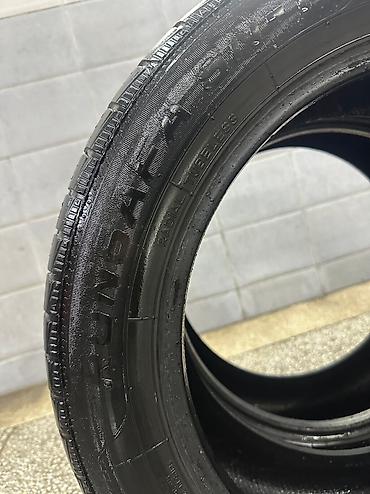 Комплект автомобильных шин. Характеристики по фото: - тип: летние шины (дорожный рисунок протектора с продольными канавками и мелкими ламелями); - посадочный диаметр: легковой размер (на фото виде...