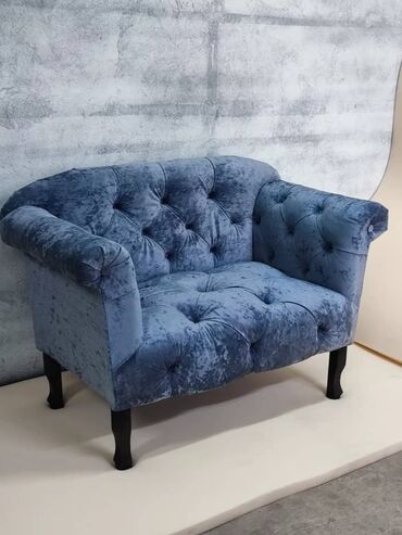 Элегантный двухместный диванчик в насыщенном синем цвете, выполненный из бархатной ткани. Отличается изогнутой спинкой и подлокотниками, а также декоративной каретной стяжкой с пуговицами на спинке...