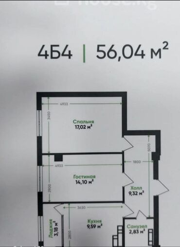 2 комнаты, 56 м², Элитка, 9 этаж, ПСО (под самоотделку)