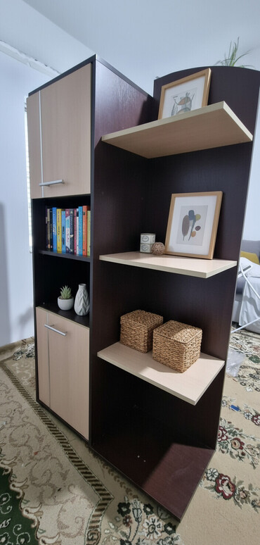 ДвухстворчатыйМногофункциональный шкаф для хранения с комбинацией закрытых секций и открытых полок. Изготовлен из темного дерева с контрастными светлыми фасадами, что придает ему современный вид. Шкаф оснащен двумя закрытыми секциями с дверцами и металлическими ручками, а также тремя открытыми полками различной высоты, которые идеально подходят для размещения книг, декора или других предметов. Изогнутый дизайн одной из сторон добавляет эстетической привлекательности. Удобное решение для организации пространства в гостиной, спальне или кабинете, обеспечивающее как скрытое, так и открытое хранение. Есть торг. Возможен вариант обмена на хороший ковер светлых оттенков или на комод серого оттенка