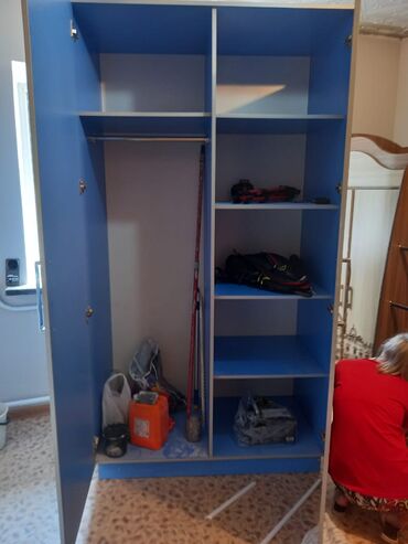 Практичный двухстворчатый шкаф для одежды с распашными дверцами, выполненный в синем цвете. Внутри шкаф разделен на две секции: одна предназначена для хранения одежды на вешалках, а вторая оборудована полками для аккуратного размещения сложенных вещей. Простой и функциональный дизайн позволяет ему гармонично вписаться в интерьер спальни, детской комнаты или прихожей, обеспечивая удобное хранение и порядок.