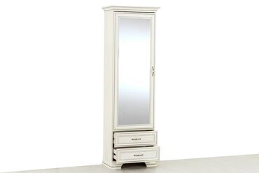 Изделие изготовлено из качественных материалов, корпус ЛДСП, фасады украшены стильными планками из МДФ, грани которых дополнены изысканной патиной. На дверце шкафа размещается большое зеркало с фацетом, позволяющее оценить свой внешний вид перед выходом в свет. Верх изделия украшен массивным карнизом, а снизу располагаются декоративные ножки. Внутри шкаф предназначен для аккуратного хранения вещей и белья. Для этого он оборудован полочками и выдвижными ящиками. Комфорта во время использования добавляют красивые ручки.