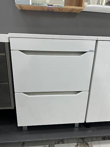 Тумба под раковину с двумя выдвижными ящиками. Раковина белого цвета, прямоугольной формы с закругленными краями. Нижний ящик отделан под мрамор. Подходит для ванных комнат с современным дизайном, обеспечивая удобное хранение ванных принадлежностей.