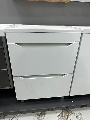 Тумба под раковину с двумя дверцами, выполненная в белом цвете. Раковина прямоугольной формы с небольшими бортиками по краям, которые могут служить для размещения мыла или других принадлежностей. П...