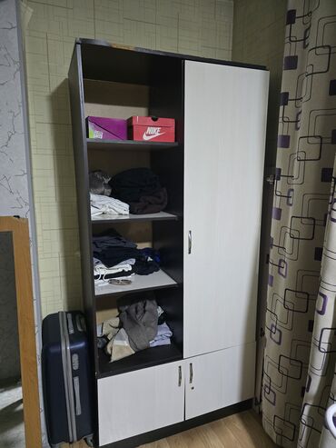 - Конфигурация: слева открытые полки (4 уровня), снизу – двухстворчатые дверцы; справа – высокий отсек за распашной дверцей и отдельная нижняя секция с дверцей.