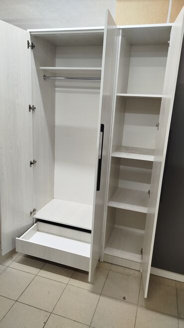 ЛДСПСовременный шкаф с распашными дверями и двумя выдвижными ящиками внизу. Гладкая поверхность дверей и минималистичные ручки создают стильный внешний вид. Шкаф идеально подходит для хранения одежды и других вещей, помогая поддерживать порядок в доме.