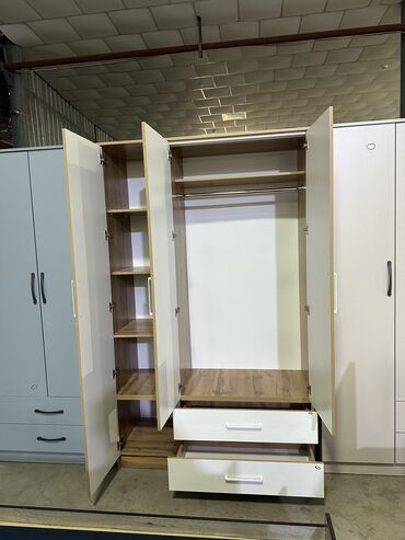 Многофункциональный шкаф для одежды, представленный в нескольких вариантах отделки, включая комбинации светлых и древесных тонов. Модель оснащена распашными дверцами и выдвижными ящиками, обеспечив...