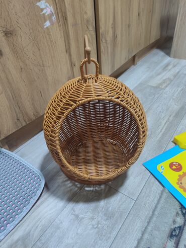 - Плетёная корзина из ротанга/лозы с круглым основанием. Имеет дугообразную ручку и верхнюю петлю для подвеса. Подходит для хранения мелочей, рукоделия, фруктов или декора.