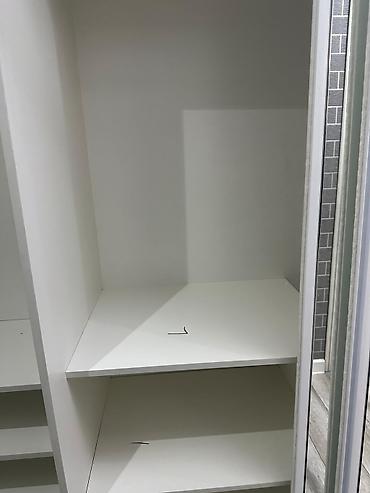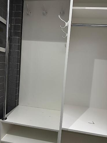 - Цвет и материал: корпус и полки — белые; алюминиевые направляющие и кромки, металлическая штанга для одежды.