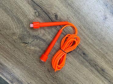 - Лёгкая пластиковая скакалка: ярко-оранжевый шнур и рукоятки из пластика, подходит для скоростных прыжков и занятий на улице или в зале.