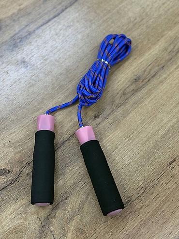 - Плетёная скакалка с мягкими поролоновыми рукоятками: шнур в синем цвете с оранжевыми вставками, рукояти с розовыми вставками и черными неопреновыми накладками для удобного хвата.