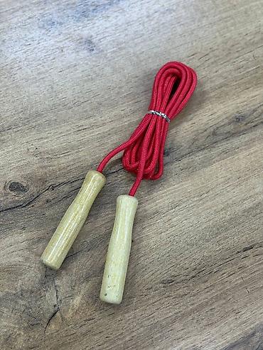 - Скакалка с деревянными рукоятками: красный шнур, гладкие деревянные рукояти классической формы.
