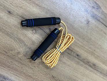 - Плетёная скакалка с утолщёнными рукоятями: шнур бело-жёлтого цвета, рукояти с черно-синими неопреновыми накладками, обеспечивают надежный хват.