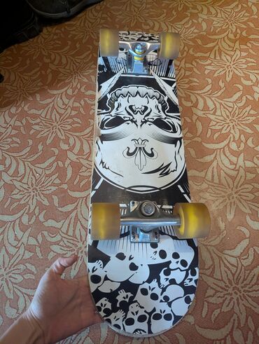 - Дека: классическая форма, двусторонний кик. Верх покрыт чёрной наждачной лентой (grip). На дне — черно-белый принт с черепами и графикой.