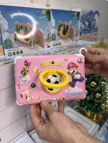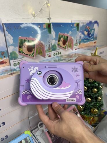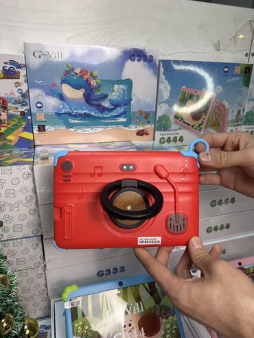 Детский планшет G-Vill G9A - Яркий коричневый чехол (фронтальная видна над экраном, задняя — на спинке). - Экран с диагональю около 7–8", под защитным бампером с утолщенными углами. - Съемный «об...