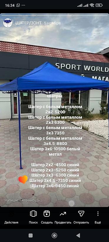 - Шатер синий: 2×2 — 4500; 2×3 — 5250; 3×3 — 6300; 5 — 7350; 3×6 — 9450.