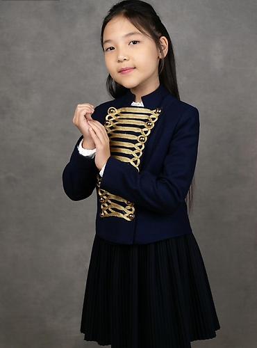 Комплект детской одежды, состоящий из укороченного пиджака и юбки. Пиджак с длинными рукавами и воротником-стойкой, украшенной ажурной вышивкой в тон изделия. Застегивается на четыре пуговицы. Юбка...