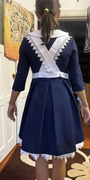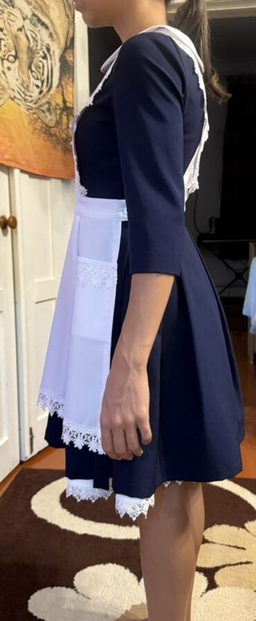 Другой цветШкольное платье темно-синего цвета с белым кружевным фартуком и подъюбником. Российского производства School Dress. Размер на рост 158. Платье имеет длину до колена и рукава три четверти. Белый фартук украшен кружевными вставками по краям, по подолу и на карманах, а также имеет объемный воротник. Застежка на молнии сзади. Воротник отстегивается. Идеально подходит для школы и праздничных мероприятий.