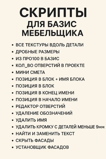 Представляем набор скриптов для программы "Базис Мебельщик", предназначенных для автоматизации и упрощения работы мебельных производств. Эти скрипты позволяют выполнять различные операции, такие как работа с текстурами, управление размерами и отверстиями, создание смет, а также функции для редактирования и замены текста. Скрипты облегчают процесс проектирования и производства мебели, повышая эффективность и сокращая время на выполнение рутинных задач. Они идеально подходят для профессионалов, стремящихся оптимизировать рабочий процесс в "Базис Мебельщик".