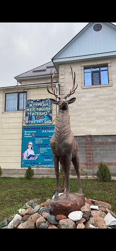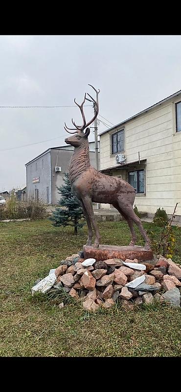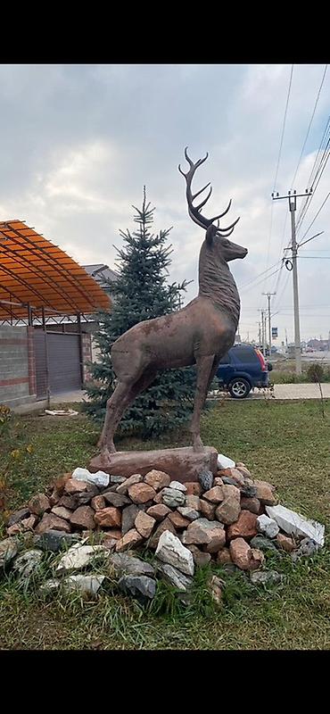 - Реалистичная полноразмерная статуя благородного оленя с ветвистыми рогами.