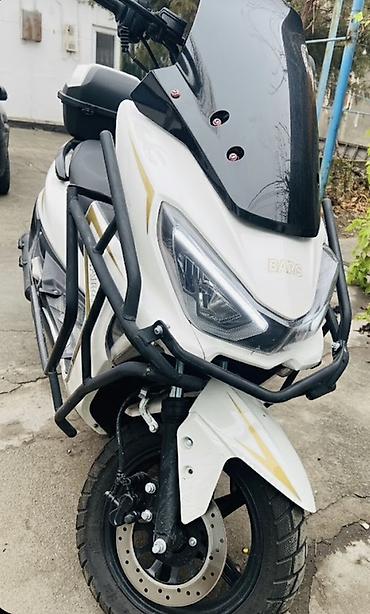 Скутер Bars, городской/пригородный класс. - Кузов: белый, защитный трубчатый обвес спереди и по бокам. - Освещение: двойная передняя оптика, светодиодные ходовые огни. - Колеса: внедорожный рисун...