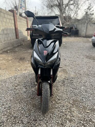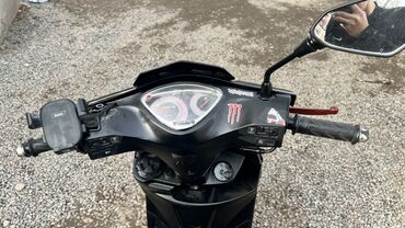 Скутер/мопед, черный, с фирменными наклейками Monster Energy. Характеристики и оснащение: - Кузов: городской скутер с широкой платформой для ног и низкой посадкой - Двигатель: бензиновый одноцилин...