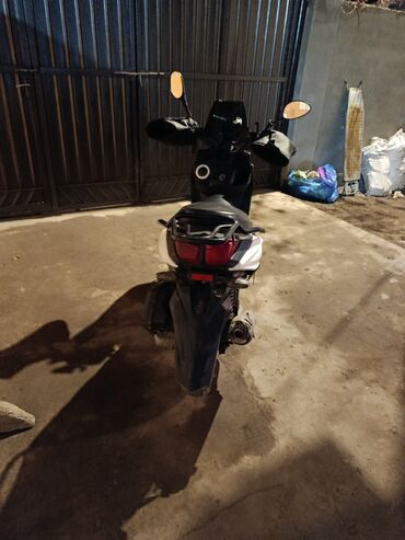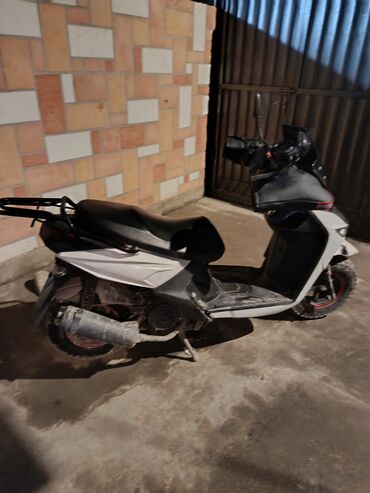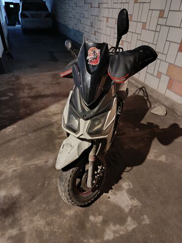 - Компактный скутер с агрессивной оптикой и спортивным обвесом в бело-черной раскраске.
