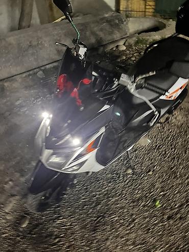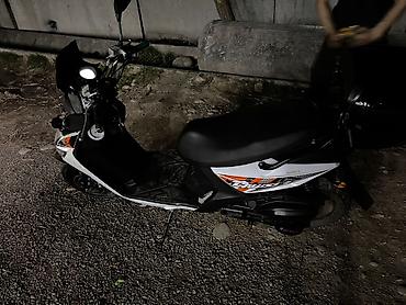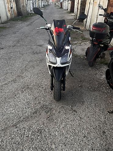 - Кузов: городской скутер, цвет черно-белый с оранжевыми элементами и фирменными наклейками; на ветровом щитке – декоративный стикер