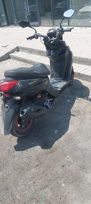 Скутер 50–125 см³ (по типоразмеру) в городском стиле. Характеристики и особенности: - Кузов с удлинённым лобовым стеклом/ветровиком, наклейки Monster Energy. - Передняя светотехника: двухсекционны...