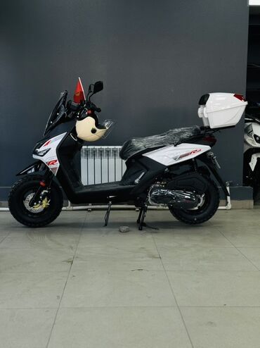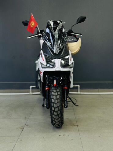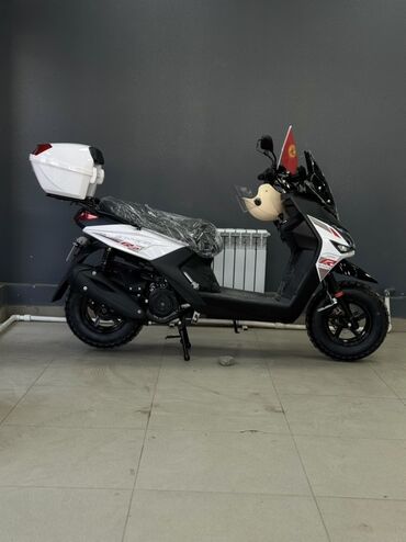 Можно поставить учет Кыргызстан 🇰🇬 Скутер белого цвета с черными акцентами и ветровым стеклом. Оборудован объемным двигателем и дополнительным багажным кофром. Подходит для городского использовани...