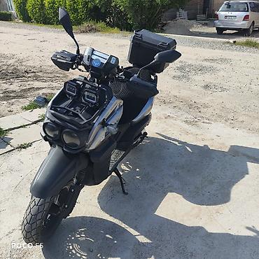 Практичный городской и пригородный скутер с туристическим уклоном: удобная посадка, защищенные рукоятки, мощное дополнительное освещение и вместительный верхний кофр. Подходит для ежедневных поездок и выездов за город по грунтовкам. Цвет: серый/черный с adventure-декалями.