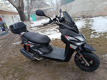 Скутер/мопед 50–125 см³ (вариатор) Описание: - Городской скутер в спортивном стиле, цвет: черный с красными акцентами и декоративными наклейками на переднем обтекателе. - Передняя оптика: двойная ...