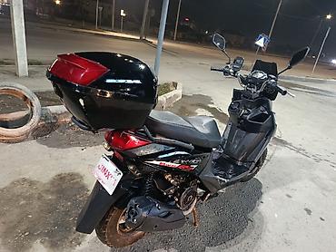 Скутер (класс 50–125 см³), красный цвет. Особенности и комплектация: - Дорожный скутер с передним дисковым тормозом и задним барабанным. - Колеса малой/средней посадки, дорожная резина. - Электрос...